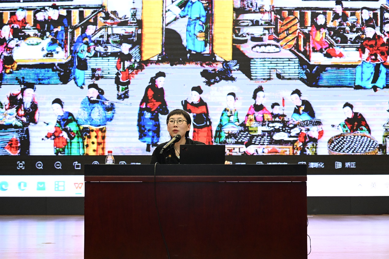 王艳介绍了杨柳青木版年画的传承与历史发展,以多幅经典作品为例细致讲述了年画蕴含的民俗文化内涵和独特艺术风格。她以创作过程为切入点,深入浅出地讲解了杨柳青木版年画的绘画风格、细致的画工与雕工、惟妙惟肖展现人物的技巧以及写实、写意与超写实等多种风格的表现形式。她特别介绍了年画中用灯芯草绘制花树的独特技艺,让同学们对杨柳青年画这一传统艺术形式有了更为全面和深入的认知。
